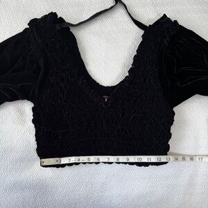 NWT FREE PEOPLE Velvet Smocked 2 Piece Skirt and Top Set in women's size medium. This stylish two-piece ensemble includes a chic cropped top and a flared mini skirt. The skirt features soft gathers for a voluminous look, slightly flounced hemline. The top features long puff sleeves with smocked wrist and crochet lace details, with an elasticized back. The ensemble can be styled as a cute romantic outfit for brunch or a party, or paired with some more gothic shoes and accessories to add some Wednesday vibes to a Goth wardrobe or getting into the Halloween party spirit. Mix and match pieces to add multiple looks to your closet.
