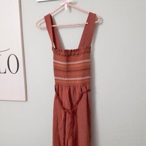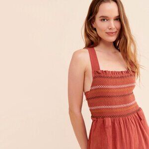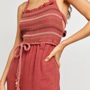 NWT Free People brick stitch work smocked bodice wide leg linen blend jumpsuit