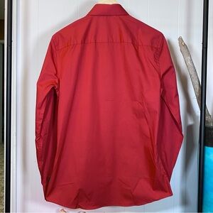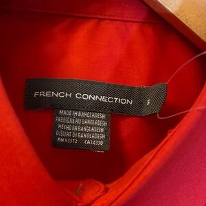 Brand new with tags. French Connection casual button shirt. Red (but not as red as the closeups make it look). Logo tag near the bottom at the side seam. Button sleeve cuffs. Size small. Regular fit. Curved hem. Logo embossed buttons.