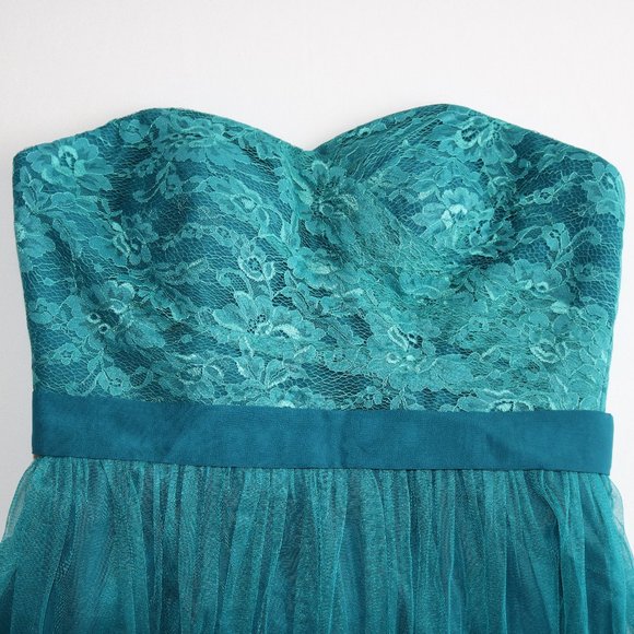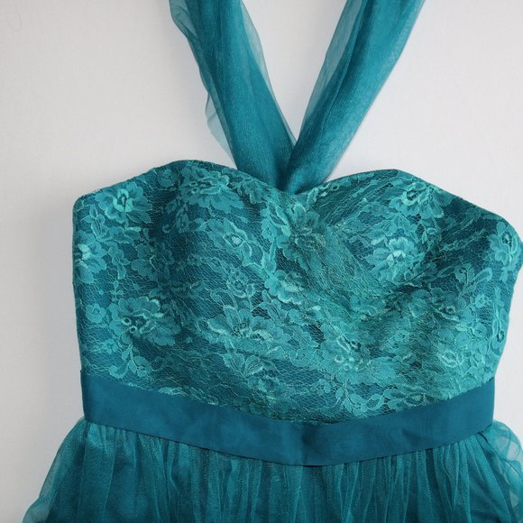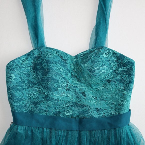 These are new with tags, full length bridesmaid dresses from For Her and For Him - search "Model 0117908" and select the colour "Winter Teal" for additional details. The straps can be worn multiple ways, or it can be worn strapless. It can be worn with or without the belt, as well. Top has light breast pads and fish bones. There are FOUR available in sizes approx equivalent to S, L, and two XL.