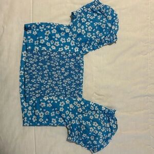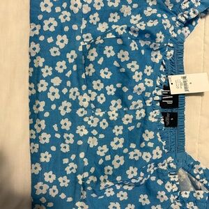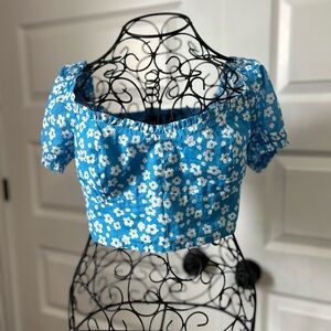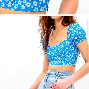 Stylish blue crop top with white floral design. Features elastic waistband for comfort. BNWT. Size Small.