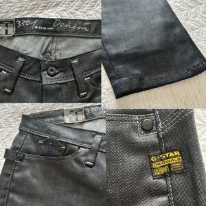 Incredible detailing and unique fabrication make these G-Star Raw Micro Midge Skinny Jeans a standout! Special dying treatment achieves its unique coated sheen appearance. Style#60271. Made in Tunisia. Comfort Glass Denim is 98% Cotton 2%Elastane. Color is ‘RAW’ which is a dark grey. Slim Fit. Size Waist 27” Length 32”. My approx flat measurements are: Waist14” Inseam33.5” Top of leg:10” Leg opening at hem 6”, hip/bum 19”, Rise 7”. Please see photos for unique details like little coin pocket, half belt at back, hem stitching, and logos. New with Tags.