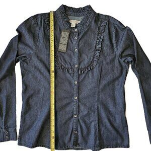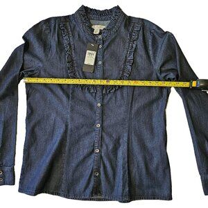 NWT GUESS Blue Denim Slim Line with Ruffle Button Down Long Sleeve Shirt Size XL