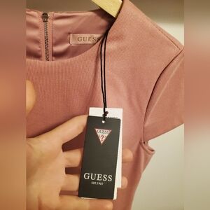 NWT GUESS Ramona dress. Shiny squared bonded suede. Round color. Short sleeves.. Blush pink. Fabric shimmers, see video. Dress length is around 36". Long zipper in the back.. From collection Spring 2023. Size S, see pictures for measurements. No stain, no rip. Non smoking house.