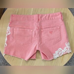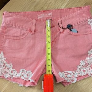 NWT GUESS Womens Peach Jean Shorts With Off-White Lace/Crochet Trim