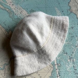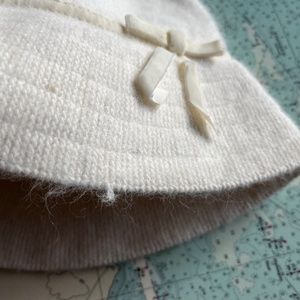 New with tags white knit bucket hat made by Gap. White velour bow and trim. Tagged as a M/L, measures approx. 7" across crown, brim is 3" wide.