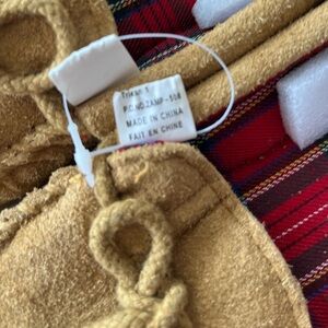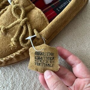 Stay cozy in these classic Details genuine suede moccasin slippers, featuring a soft, warm interior with a red plaid flannel lining and traditional whipstitch detailing. These slippers are new with tags and made from real leather (as stamped on included leather swatch). Comfortable and durable with a cushioned sole and rubber treaded bottom, perfect for indoor lounging.