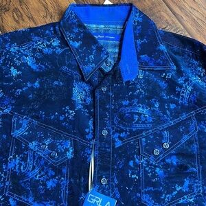 Absolutely gorgeous lightweight fine corduroy button down shirt in a moody blue paisley pattern. Has patterned cuffs to a dd great style and detail when you roll your cuffs. Classic detail of crushed velvet ribbon down the left side.
