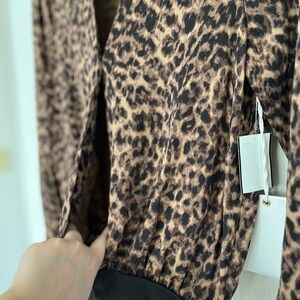 Long sleeves with split cuffs. V-neckline. Sepia leopard print. Gathered at waist for blouse effect.