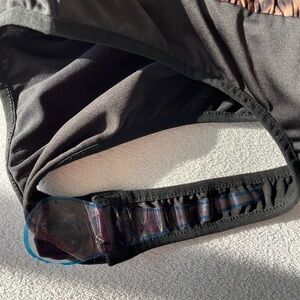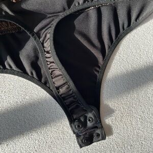 Thong bottom with snap gusset. Bottom portion is a stretch fabric. Sanitary sticker in place.