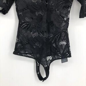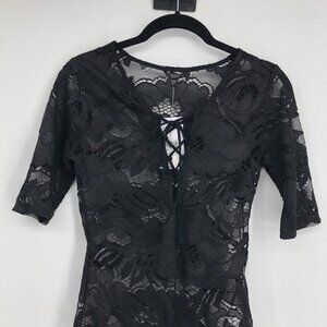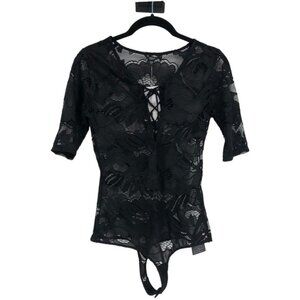 NWT Guess Black Lace Up Sheer Floral Lace Corset Bodysuit Mesh 1/4 Sleeve size S