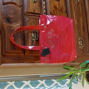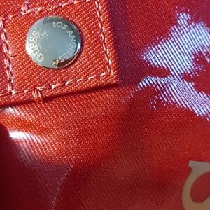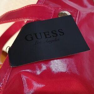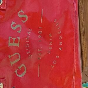 - shiny red tote with Gold Guess Original Est. 1981 Denim Los Angeles on front