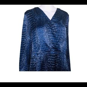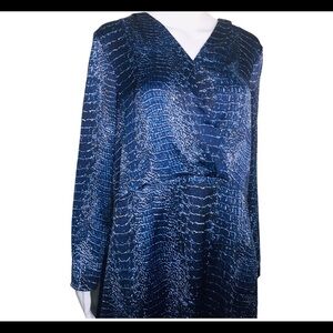 NWT HALSTON Tonal Snake Print V Neck Crossover Long Sleeve Dress Navy Blue Small