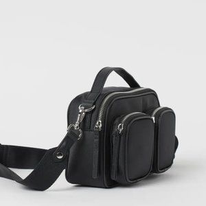 Bag in woven fabric with imitation leather details, a handle and zip at the top and a detachable, adjustable shoulder strap.