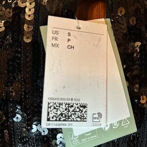 Mock neck and slightly cropped, this sequinned beauty is slightly sheer and has a unique pattern of sequins. Tried to capture the pattern in pic #3 with white fabric underneath. Slight bell sleeve. One button and keyhole closure in the back. 95% recycled polyester. Purchased for an event, I decided on something else so it has never been worn. Ptp 19", length 20" measured from middle of neck seam on the back.