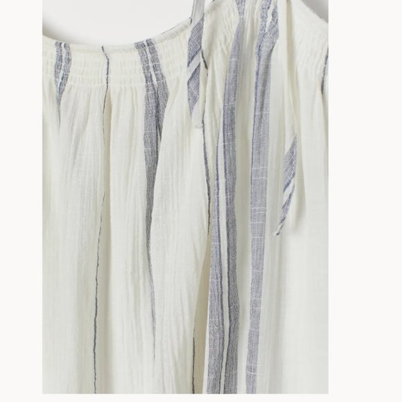 Wide, ankle-length dress in an airy cotton weave with smocking at the top, narrow shoulder straps with decorative ties at the top, and a slit at the front.