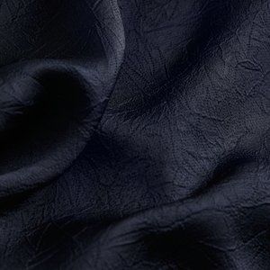 Woman's dark blue/navy, calf-length dress in woven fabric. Low-cut V-neck at front with concealed hook-and-eye fastener. Wide, elbow-length sleeves, elasticized seam at waist, and sewn, wrapover skirt. Unlined.