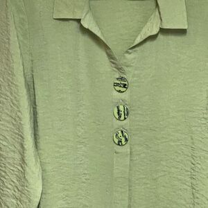 Beautiful top with decorative marble button detailing and concealed button closure finishing it off. 3/4 sleeves with side vent slits in a gorgeous Fern Color. The material is a crinkle or waffle texture.