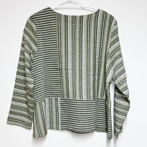 Description: Olive green with white and grey colored space dyed yarns stripes to create this playful comfy top. 3/4 cuffed sleeve with decorative and functional lower buttons. A crinkled cotton hides wrinkles and travels well.