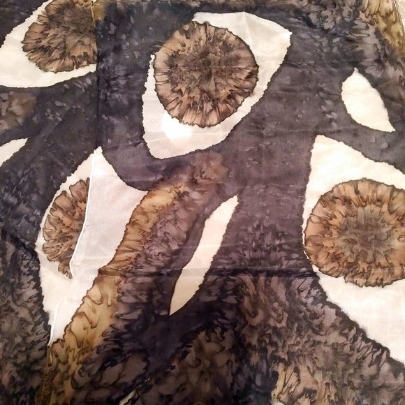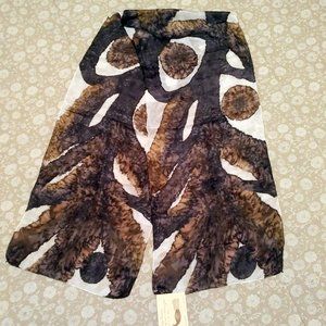 NWT Hand-Painted Silk Scarf, White, Brown & Black Watercolor