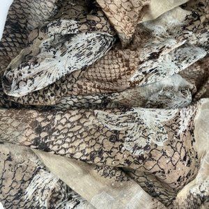 Elegant and timeless, this handmade viscose-polyester scarf by Sana features a sophisticated abstract snakeskin-inspired pattern in shades of beige, brown, and ivory.
