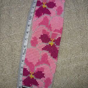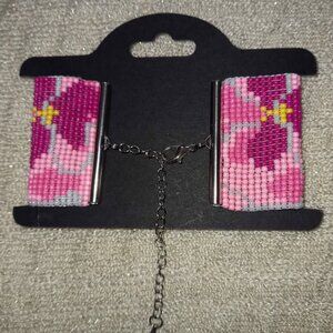 Add a pop of artisan color to your style! This wide-loomed beaded cuff features a stunning pink floral tapestry design.