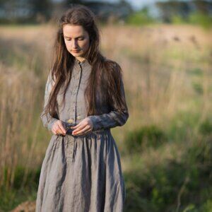 This is a well structured yet easy-to-wear Victorian style dress in sturdy heavyweight linen. Selling only because I own one in another colour for which I end up reaching, making this brown one sitting in the closet unworn. Perfect fall/winter linen dress!