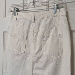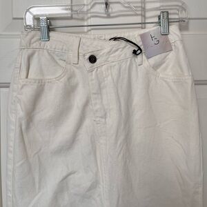 Crisp, structured, and effortlessly cool — this white denim midi skirt from Happily Grey features a high waist, raw hem, front slit, and classic 5-pocket styling with popular asymmetric cross-over waistband.