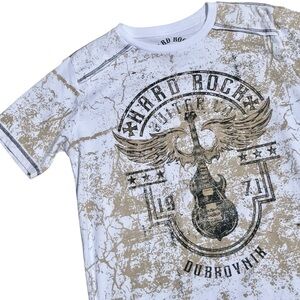 NWT Hard Rock Cafe Guitar Co White Gold Winged Acid Cotton T-shirt Mens. There is a wee hole on ribbed part of neck. The graphic on the front of this tee is so awesome. The black has a bit of shimmer when the light hits it. Tee is from Dubrovnih, Croatia. 100% cotton. Machine wash inside out and hang to dry. Made in Egypt. Sold for $38 Euros which is equivalent to $59 Canadian.
