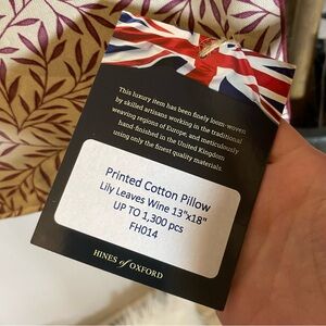 Brand new with tags. Lovely Hines of Oxford tapestry pillow cover in Lily Leaves Wine pattern. 13” x 18”. Made in England. Velvet back. This is a rare sample piece.