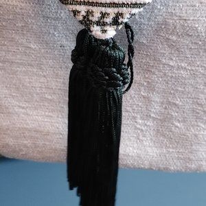 Green and White Christmas table runner. Mistletoe motif. Dark forest green tassels.