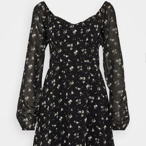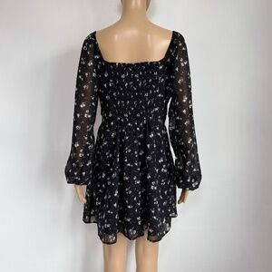 This NWT Hollister sweetheart neckline longsleeve mini dress in black with white floral print, women's size L. Perfect for giving cottage core whimsical romantic vibes.