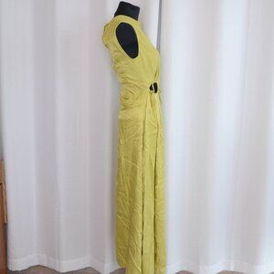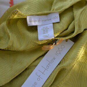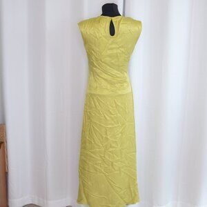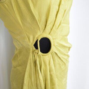 Stunning satin slip side tie keyhole dress from House of Harlow 1960. In a beautiful chartreuse colour, This sleeveless dress features a gathered keyhole side tie, side slit, side zip, keyhole back at neck. A perfect wedding guest dress.