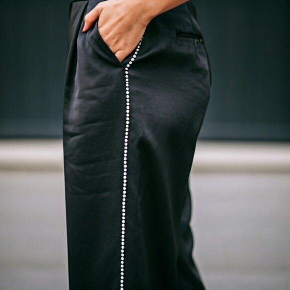 NWT House of Harlow black satin-like rhinestone embellished wide leg trousers, M