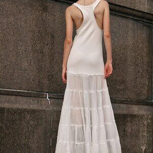 Add an elevated piece to your slips collection with this stunning maxi version featuring a scoop neckline, dropped armholes, and sheer, tiered skirt detail for the perfect finishing touch.