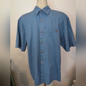 NWT Island shores linen blend short sleeve button up shirt, blue, geometric triangle diamond pattern. Brown hardwood  look buttons Size Large