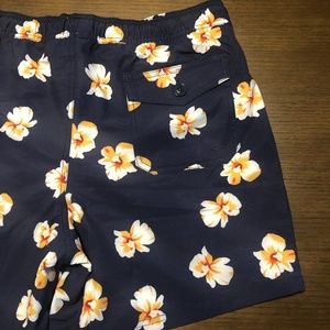 NWT J.crew swim trunk in navy floral. A classic swim trunk with a modern slim fit, while keeping its old-school drawstring waist and adding a mesh lining to keep you comfortable in the water, lounging poolside or on the beach. This lightweight stretch swimsuit is crafted from environmentally friendly UPF 50 protected fabric made with recycled nylon. On-seam pockets, back pocket with button closure and inside waist hidden pocket.