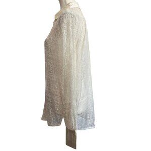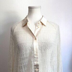 JASON WU CREAM SEETHROUGH LACE SATIN BUTTON DOWN TUNIC, this is a chic sleek classic yet sexy and modern romantic cream tunic-shirt, button down shirt in a very long length and a loose relaxed fit in full seethrough lace with satin trim - unlined- stretch - collared - perfect over a camisole , crop top, bralette depending on where you are going - layer it with a blazer for work and take the blazer off for a more revealing outfit at night - day to night to to shirt with a jeans, a pencil skirt or a satin pants. Formal city-chic.