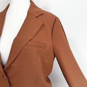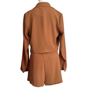 JASON WU RUSSET BROWN SKIRT CROPPED BLAZER COORDINATED SET, This is a neutral minimalist trendy contemporary russet brown cropped blazer and skort coordinated set - blazer features a notch lapel collar and a single breasted style with long sleeves with slightly slit cuffs - unlined - no shoulder pads for a totally flowy soft shell - short in length which gives the skort all its sens with the same minimalism neutral earthly tone color - this skirt with shorts combo has a side zip fastening, stretch and comfy - wear it durring summer for a business summer look or bring it in cold seasons with a fall opaque stocking or leggings and boots trendy street-chic outfit - wear it with a simple t-shirt underneath - a lace bralette for a sexy touch or a classic collared shirt.