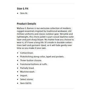 "Versatile and lightweight, this chore jacket is part casual daytime outer layer and part sharp blazer. Made in durable cotton-linen twill and garment-dyed, so it will fade gently over time as you make it you make it your own."