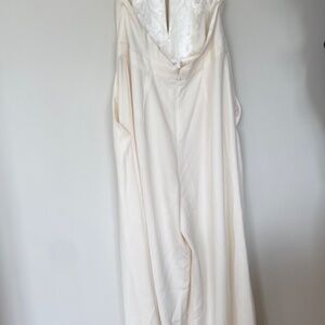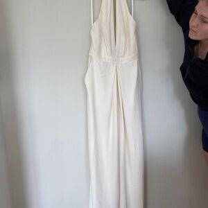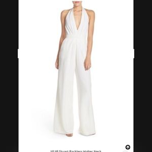 Elegant halter neck jumpsuit. Features a deep V-neckline. Flattering wide-leg design.