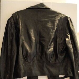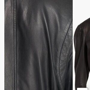 Experience the sleek elegance of Joie's black leather jacket, featuring a modern cropped design and a striking, structured collar. The 3/4 length sleeves enhance its contemporary appeal, making it an ideal choice for both casual and semi-formal settings.