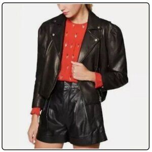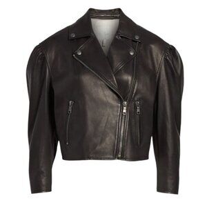 NWT Joie Black Leather Moto Jacket Lambskin Cropped Puff 3/4 Sleeve Biker Jacket