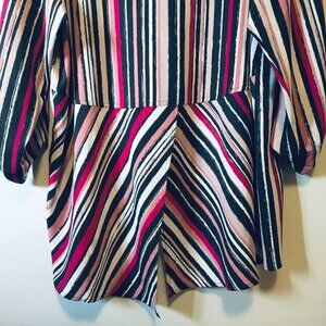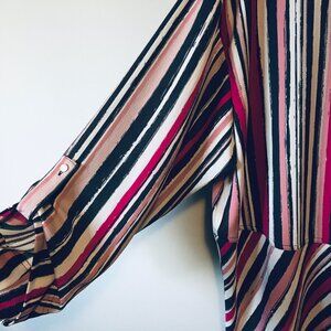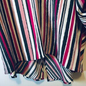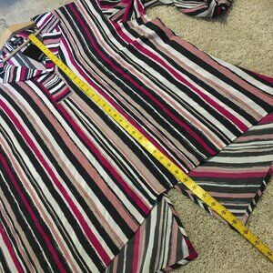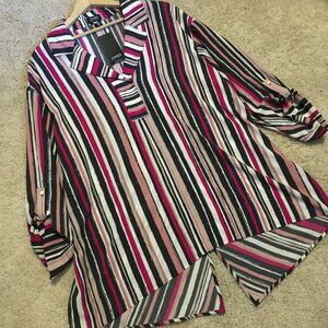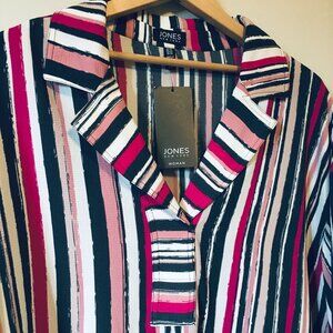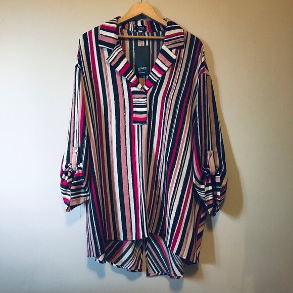 Very good unworn condition, brand new with tags pink, black, magenta vertical striped, tunic dress shirt by Jones New York. This is a very nice cut. Could be worn with a cotton tank top or camisole for style and comfort.