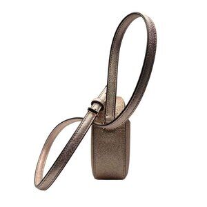 Lining: Two Way Script Logo Lining - imported. Perfect futuristic metallic oval trendy modern bag in a fun gold metallic finish with an adjustable strap - shoulder and crosbody bag. Festive, perfect for party, evenings, clubbing, holidays, new years eve and more. Choose a little black dress for the perfecft match.