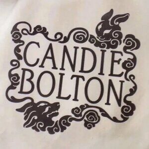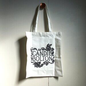 Excellent unused condition tote book or trick-or-treat canvas white (with maybe a trace tint of cream) bag featuring a bake-kujira in blues, reds and yellows on one side, and the artist's logo in black, Candie Bolton, on the opposite side. This is the second bag I am selling. Please note the difference in the the folds of fabric. Perfect for trick-or-treating, carrying books, or transporting groceries.