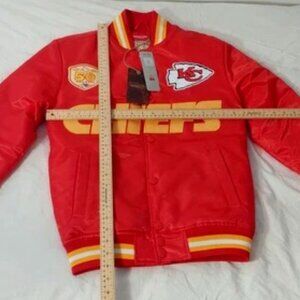 This is a Kansas City Chiefs Women's Coaches Puffer Jacket by Mitchell & Ness, a high-quality NFL officially licensed jacket. Here's a detailed description and specifications: