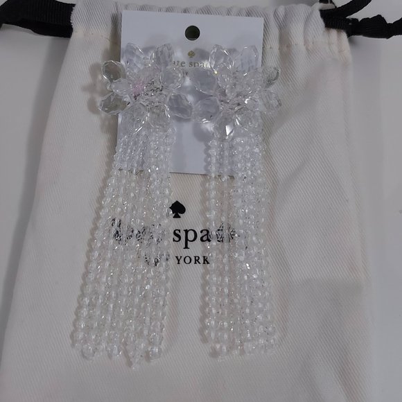 Brand new with tags Kate Spade Full Flourish clear statement earrings. The earrings are mostly white/clear, with a little hint of pink in some beads in the center. This purchase comes with a Kate spade gift pouch. Please note that these earrings do have a bit of weight to them.