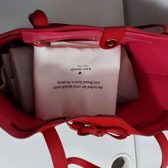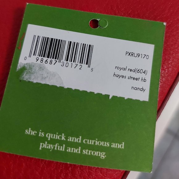 Brand new with tags Kate Spade Hayes Street red Nandy tote. The bag has a button closure but has a secured zipper pocket. Comes with dust bag but please note there are some marks on the dust bag [image 6] which can most likely come out if washed. There is also a small dent in the back of the bag [image 7] from being pushed against a surface in storage.