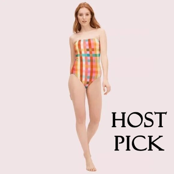 NWT Kate Spade multicoloured checkered plaid bandeau neckline with optional halter strap one piece swimsuit